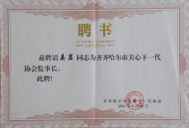 6月20日上午九点,在党政办公中心6号楼4楼6408会议室召开齐齐哈尔市关心下一代协会第一届会员大会暨协会成立大会,省关工委领导以及市相关领导出席本次成立大会。校工会主席姜岩被聘为齐齐哈尔市关心下一代协会监事长。