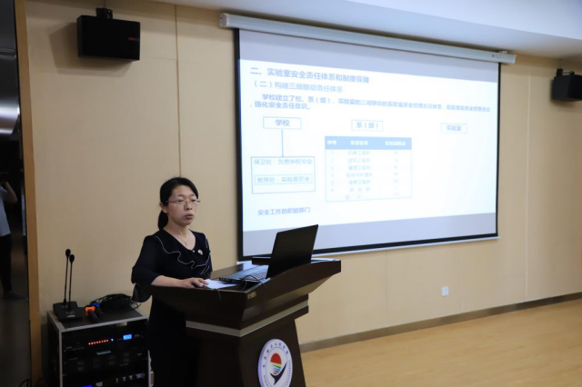 首先,教务处副处长杨静霞结合学校实验室基本情况、实验室安全责任体系和制度保障、实验室安全教育、实验室安全日常管理等内容向专家工作组进行汇报。