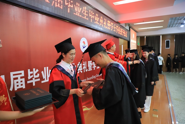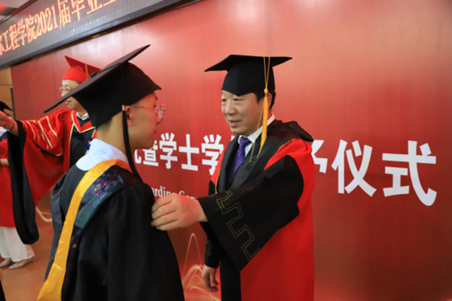 毕业生代表在《加冕进行曲》中依次走上主席台,由理事长曹勇安教授逐一为获得学士学位的毕业生扶正流苏,院长曹然彬为他们正衣冠,学校学术委员会主席、副院长蒋春艳为他们颁发学位证书。