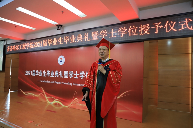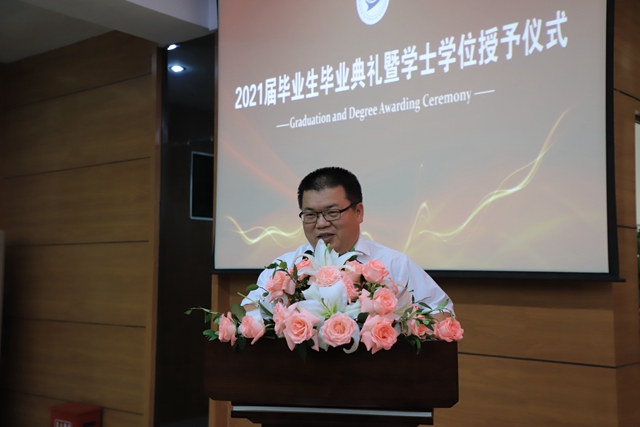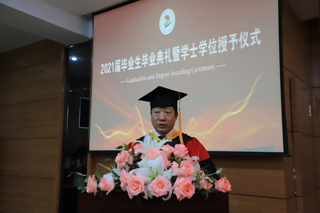 创校校长、理事长曹勇安教授对毕业生们提出了殷切的希望,希望同学们不忘初心,永远记住今天的毕业典礼,是人生中最难忘的一课。强调要记住个人成长要融入团队之中,要学会团队合作。指出自我分为自然的我、内心的我和社会的我,自然的我——流年似水,不可抗拒;内心的我——永远风华正茂,挥斥方遒;社会的我——水击三千。他用亲身经历勉励同学们要努力学习,用生命影响生命,用智慧点燃智慧,不负时代,不辱使命。希望同学们秉承学校“为融入社会走进来,为服务社会走出去”的办学理念,传承学校倡导的“亮剑精神”,在未来工作、学习和生活中勇敢地面对挫折,乘风破浪,所向披靡!希望各位同学随时回到母校来,以各种方式参与母校建设,与母校共同成长。同时向为同学们成长成才付出辛勤汗水的老师、家长、企事业单位致以崇高的敬意和衷心的感谢。