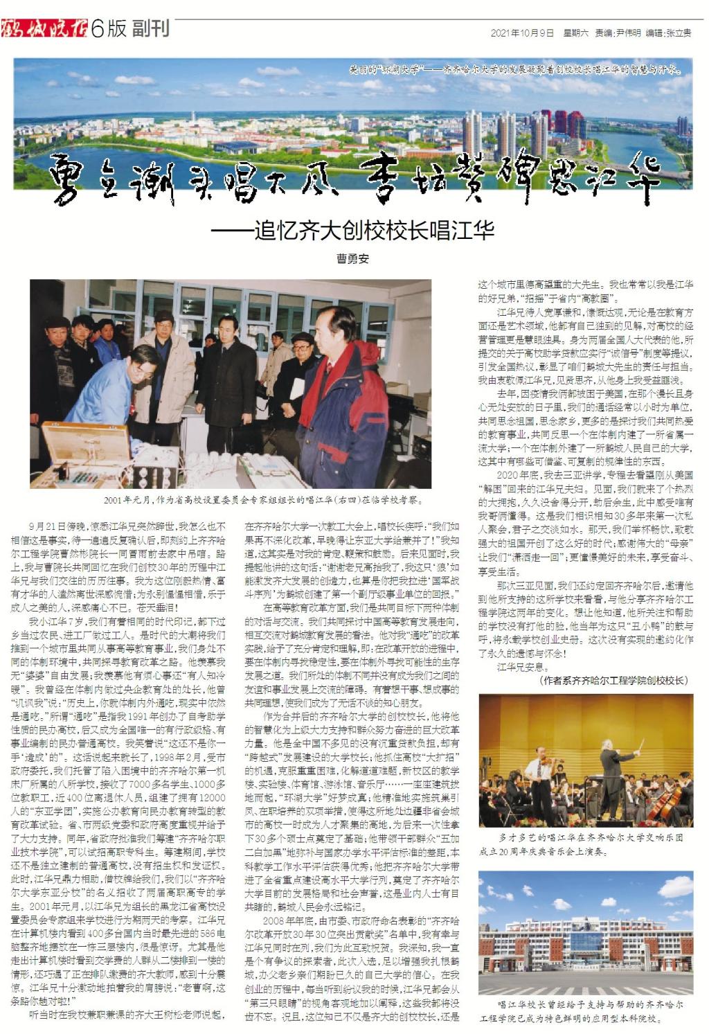 我小江华7岁,我们有着相同的时代印记,都下过乡当过农民、进工厂做过工人。是时代的大潮将我们推到一个城市里共同从事高等教育事业,我们身处不同的体制环境中,共同探寻教育改革之路。他羡慕我无“婆婆”自由发展;我羡慕他有烦心事还“有人知冷暖”。我曾经在体制内做过央企教育处的处长,他曾“讥讽我”说:“历史上,你就体制内外通吃,现实中依然是通吃。”所谓“通吃”是指我1991年创办了自考助学性质的民办高校,后又成为全国唯一的有行政级格、有事业编制的民办普通高校。我笑着说“这还不是你一手‘造成’的”。这话说起来就长了,1998年2月,受市政府委托,我们托管了陷入困境中的齐齐哈尔第一机床厂所属的八所学校,接收了7000多名学生、1000多位教职工,近400位离退休人员,组建了拥有12000人的“东亚学团”,实施公办教育向民办教育转型的教育改革试验。省、市两级党委和政府高度重视并给予了大力支持。同年,省政府批准我们筹建“齐齐哈尔职业技术学院”,可以试招高职专科生。筹建期间,学校还不是独立建制的普通高校,没有招生权和发证权。此时,江华兄鼎力相助,借校牌给我们,我们以“齐齐哈尔大学东亚分校”的名义招收了两届高职高专的学生。2001年元月,以江华兄为组长的黑龙江省高校设置委员会专家组来学校进行为期两天的考察。江华兄在计算机楼内看到400多台国内当时最先进的586电脑整齐地摆放在一栋三层楼内,很是惊讶。尤其是他走出计算机楼时看到交学费的人群从二楼排到一楼的情形,还巧遇了正在排队缴费的齐大教师,感到十分震惊。江华兄十分激动地拍着我的肩膀说:“老曹啊,这条路你趟对啦!”