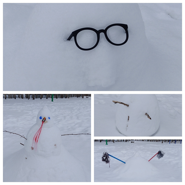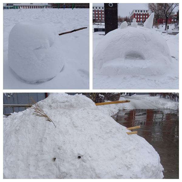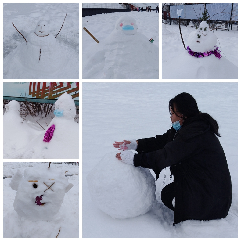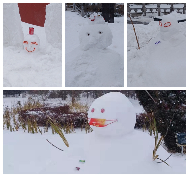 大家就地取材,发挥想象,把雪人做得校园里随处可见。