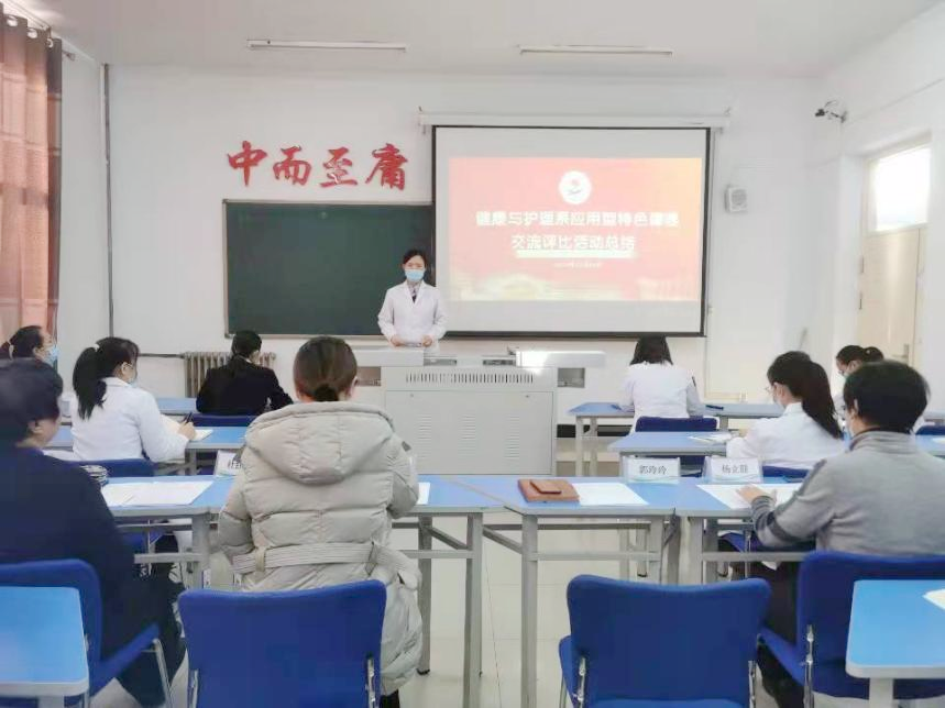 12月29日上午,健康与护理系全体教师在一号教学区1215教室举行健康与护理系2021年度“应用型特色课程交流评比”活动。健康与护理系负责人郭玲玲、教学指导专家杨立群、健康服务与管理专业带头人杜红梅担任评委,全体教师参加。活动由教学副主任张苗主持。