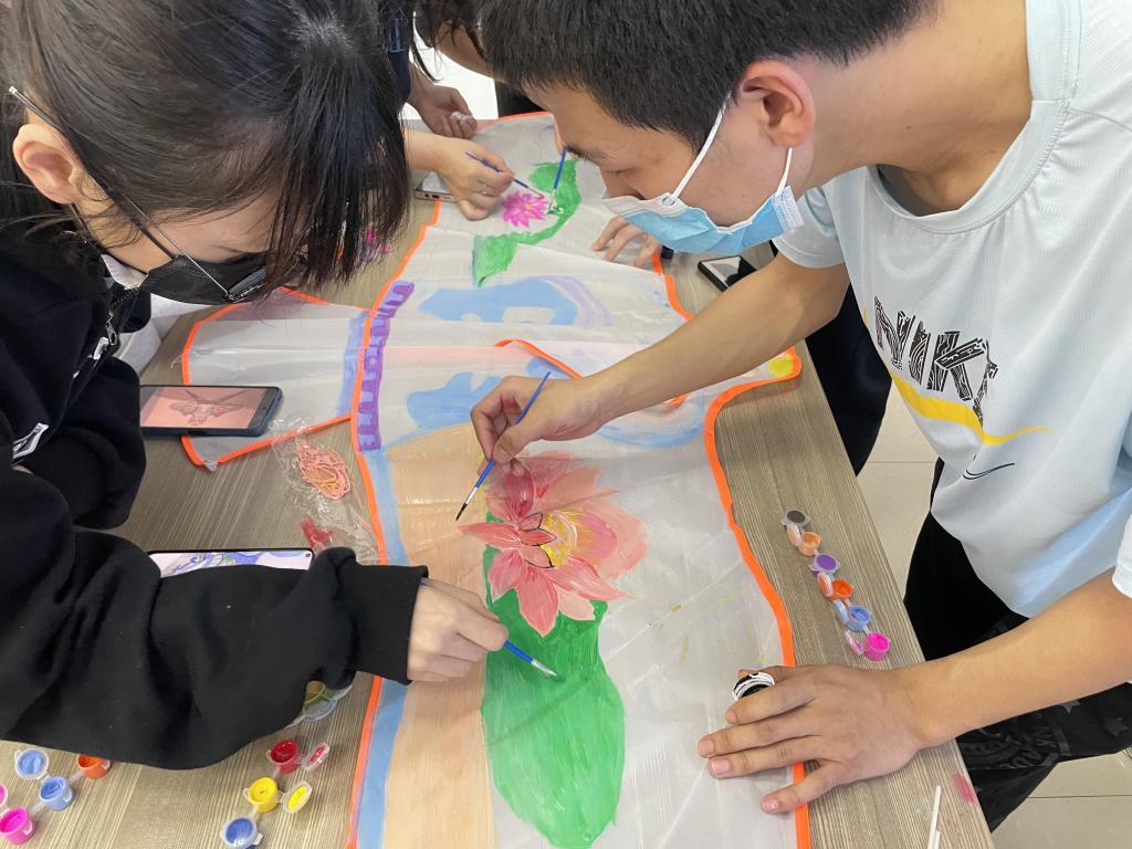 比赛期间,每组参赛选手在打底稿、调颜料、上色等制作程序上分工明确,整个绘制过程有条不紊,同学们按着心中设想的图案,用画笔在纸上缓缓展开,那一笔一画,一色一调,无不为梦想插上了翅膀。画作完成时,参赛选手的脸上都洋溢着开心的笑容,充分体会到团队协作的快乐。
