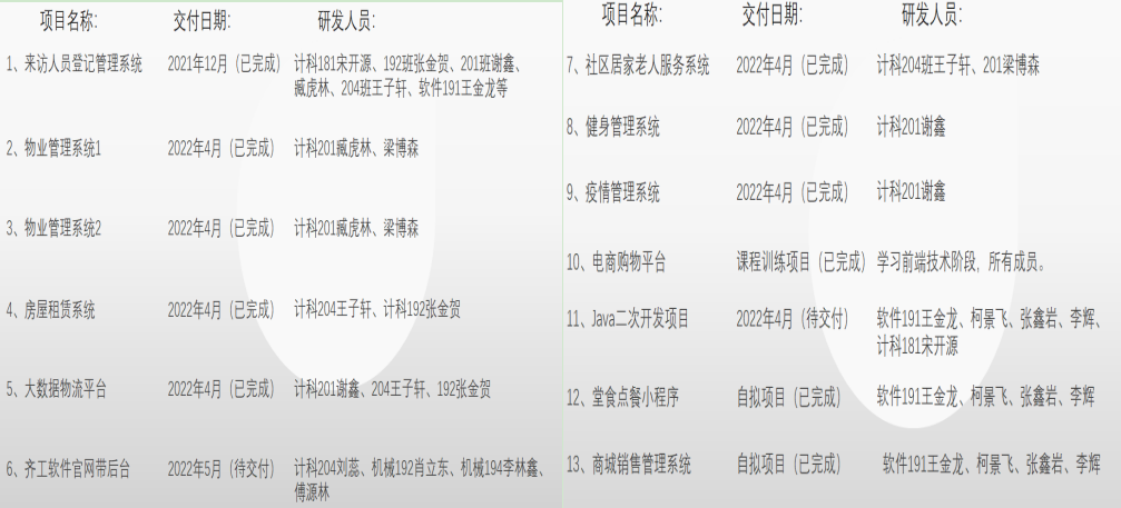 由创业学院科技园联合园区入驻企业中思(齐齐哈尔)科技有限公司及八位中思学员成立的软件项目小组,主要职责为解决市场化需求、承接软件开发项目,展现了较强的专业实践能力。项目组成员为:计科201谢鑫、臧虎林、梁博森、庄敦祥、计科203王子轩、计科204王杰、计科192张金贺、计科213沈乘人。去年至今年4月7日,学员开发的项目总数13个。
