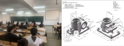 比赛首先由先进成图室成员张康、柳皓然、刘继成等学长进行现场指导,设置投影基础与制图基础笔试题,学生根据题目在规定时间内尺规绘图,重点考查学生的基本体的投影、立体表面交线、组合体构型与看图样画法知识能力。本比赛要求,卷面试题用尺规绘制,视图绘制执行最新颁布的国家标准。
