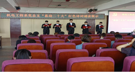 “七一”前夕,机电工程系在图书馆501会议室召开 “喜迎二十大、喜迎七一”主题红歌诗词朗诵活动。机电系党总支书记王丽萍主持活动,80余名党员参加。