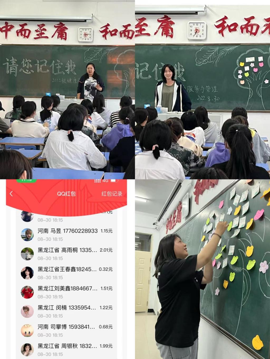 8月30日晚,健管221班同学召开专业第一课“请您记住我”主题班会。在专业长毕茎娜老师一段精彩的开场白后,“请您记住我”主题班会正式开始。毕老师要求同学们将自己的优点、特点写到便利贴上,自我介绍时将便利贴贴到黑板的班级树上,班会结束后再将便利贴贴到自己的成果档案本中。班会上,同学们以抢到名字为“让一让,我先来”红包的先后顺序进行自我介绍,同学们热情参与,积极互动,现场的气氛轻松活跃。