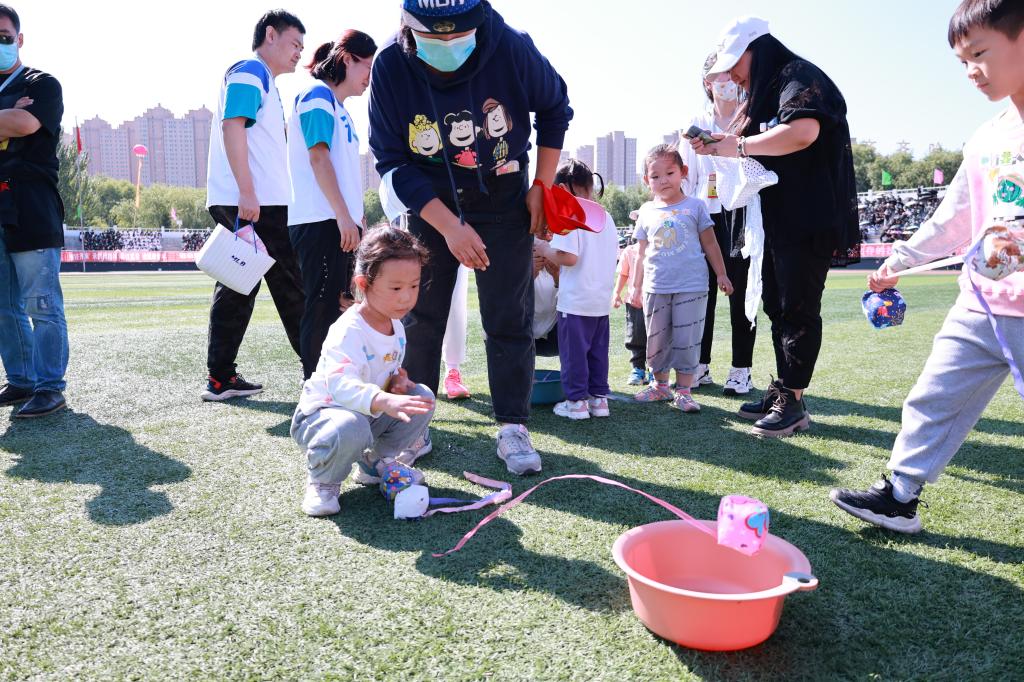 秋风吹叶易湖边,艳阳高照运动场。9月16日,在学校的体育场上彩旗招展,欢声又笑语,2022年秋季田径运动会召开了。特别引人注目的是一支平均年龄4岁近40名的小朋友运动员,他们拉着“教工子弟运动队”的横幅,随着音乐,在家长的陪伴下,大手拉小手欢快地走向运动场中央,参加“比赛”。