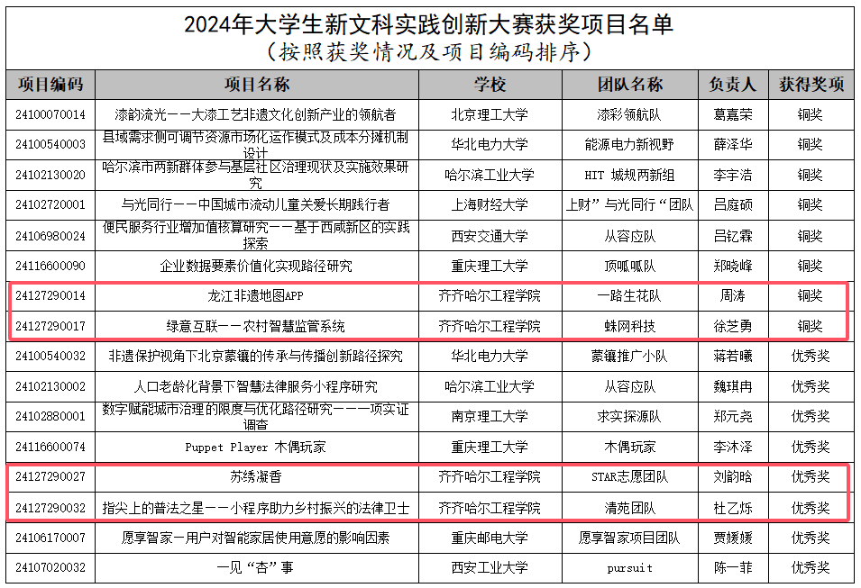 学校精心组织4个项目参赛成功突围,晋级国赛。经过初赛和决赛网评赛。最终,建筑管理工程系“龙江非遗地图APP”、机电工程系“绿意互联—农村智慧监管系统”2个项目荣获国家级铜奖,康护工程系“苏绣凝香”、信息工程系“指尖上的普法之星—小程序助力乡村振兴的法律卫士”2个项目荣获国家级优秀奖。