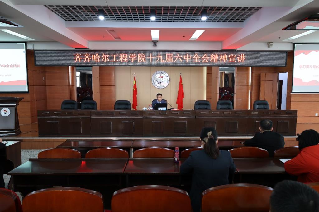 按照省委教育工委和市委相关要求,根据校党委的工作部署,4月23日,beat365召开十九届六中全会精神宣讲会。依据防疫要求,全体干部在图书馆601报告厅参会,骨干学习班其他成员、全校其他教工党员、全体学生党员线上参会。