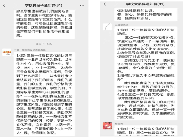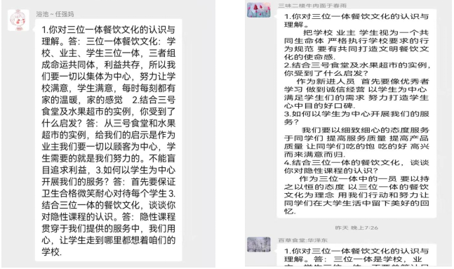 本次培训借鉴学校工作坊的学习模式,以问题为导向深入学习、探讨,共收到业户上交作业35份。在作业中可以看到大家达成以下共识:管理离不开学校的文化,学生的需要就是业户们努力的方向;隐性课程贯穿于业户提供的服务中;三位一体,诚信经营,利益共存,命运共存。
