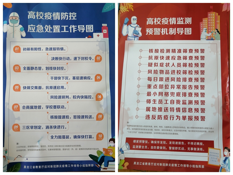 5月9日,学校办公室在寝室、食堂、教学楼等人流量较大的重点位置张贴《高校疫情应急处置工作导图》《高校疫情监测预警机制导图》。 《高校疫情防控应急处置工作导图》《高校疫情监测预警机制导图》是黑龙江省教育厅应...